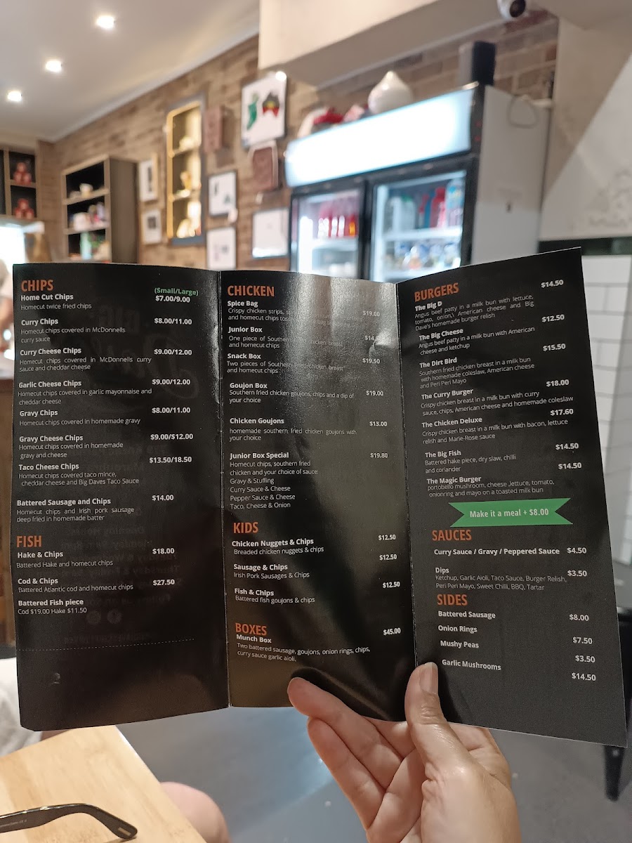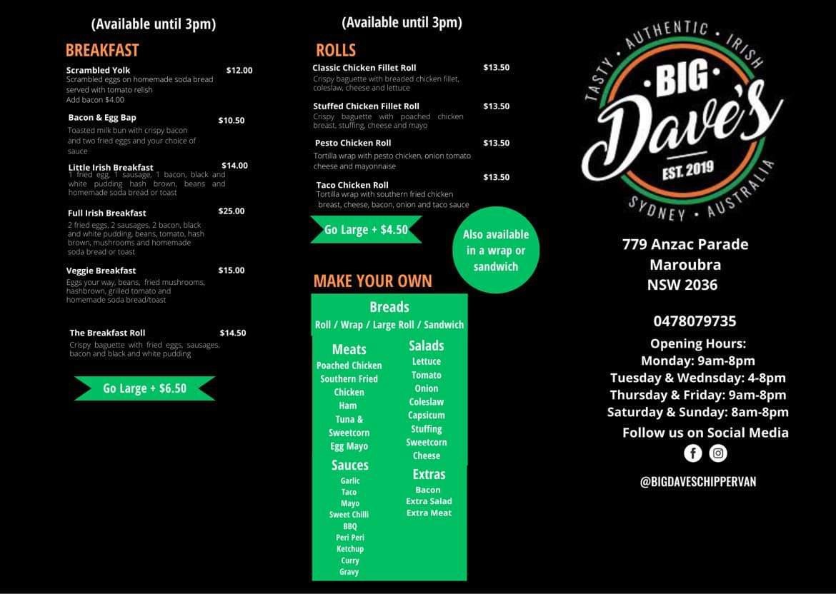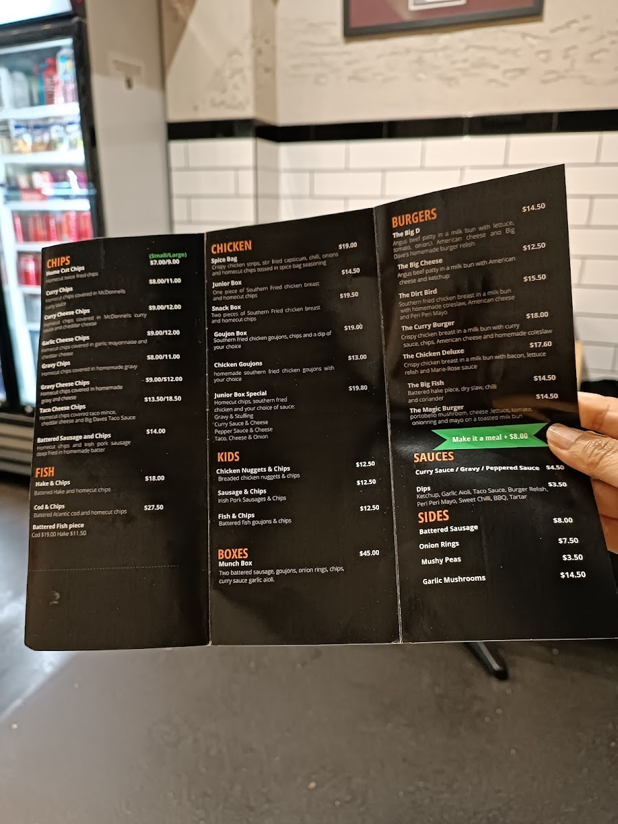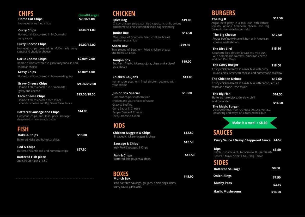 Big Dave's Chipper offers a diverse and mouth-watering menu that caters to all tastes and preferences. For breakfast, the Scrambled Yolk and Full Irish Breakfast are hearty options, while the Veggie Breakfast and Little Irish Breakfast provide lighter alternatives. Their rolls, such as the Classic Chicken Fillet Roll and Stuffed Chicken Fillet Roll, are packed with flavor, with options like the Pesto Chicken Roll and Taco Chicken Roll for those seeking something more unique. When it comes to chips, you can enjoy classic Chips or indulge in the cheesy goodness of Curry Cheese Chips and Garlic Cheese Chips, with exciting variations like Taco Chips and Gravy Cheese Chips. The kids' menu offers simple, satisfying choices like Sausage and Chips and Fish and Chips. For burger lovers, the Quarter Pounder Burger and Southern Fried Chicken Burger are popular picks, and vegetarians can enjoy the Vegic Burger. Chicken options include the tasty Chicken Plece and the ever-popular Junior Box and Snack Box. If you're craving fish, there's the Fish of the Day and Cod options, served with Chips and Mushy Peas. Don't forget to try the Fish Burger or indulge in the Cod and Chips. Their drink menu features refreshing choices such as Powerade and Imported Cans, along with hot beverages like Mocha, Latte, and Flat White. For those after a hearty meal, the Munch Box and The Big D are perfect, while the Curry Burger adds a spicy kick to your meal. Whether you're in the mood for a filling breakfast, a quick snack, or a satisfying dinner, Big Dave’s Chipper has something for everyone.